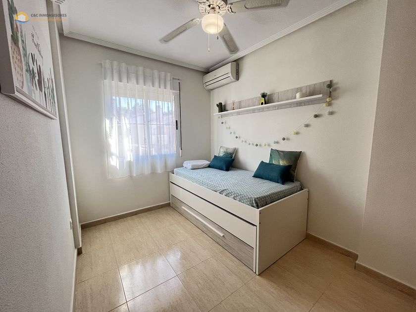 Deze zeer nette woning op een unieke locatie beschikt over 2 slaapkamers en 1 badkamer met een gezamenlijk zwembad en op slechts 300 meter van het strand. Het is gelegen in een nette afgesloten urbanisatie. Dit is zeer gunstig voor zowel de veiligheid als parkeergelegenheid. Het zwembad en de tuin zijn ook perfect onderhouden. Zeer goede connectie met de doorgaande wegen naar het centrum van Guardamar del Segura en Torrevieja.